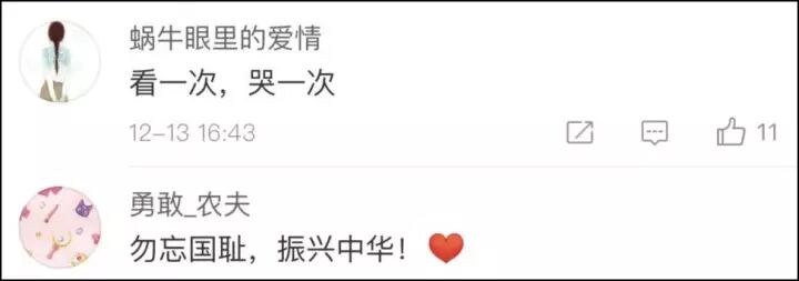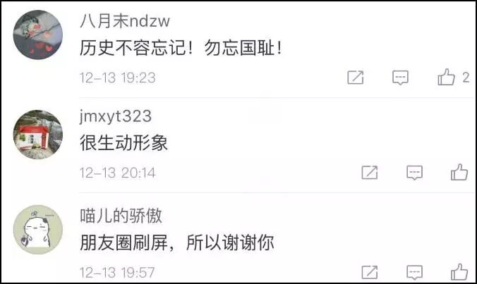 在公祭日当天,这张催泪的漫画以极快的速度在网络平台传播开来,人们既感动又心酸,写下“勿忘国耻,珍惜和平”等留言,纷纷转发。